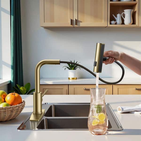 90 Degree Single Handle Pull Down Sprayer Kitchen Faucet with 12.4 in. High Pull Out Spray Wand Deckplate in Gold