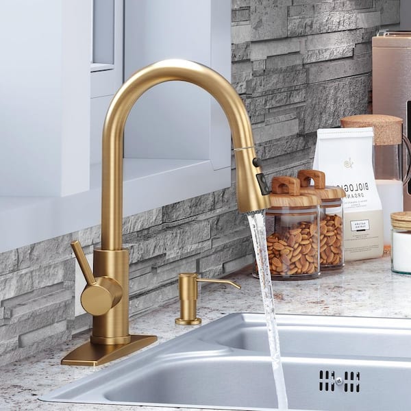 Single Handle Pull Down Sprayer Kitchen Faucet Gooseneck Kitchen Sink Faucet with Soap Dispenser in Gold
