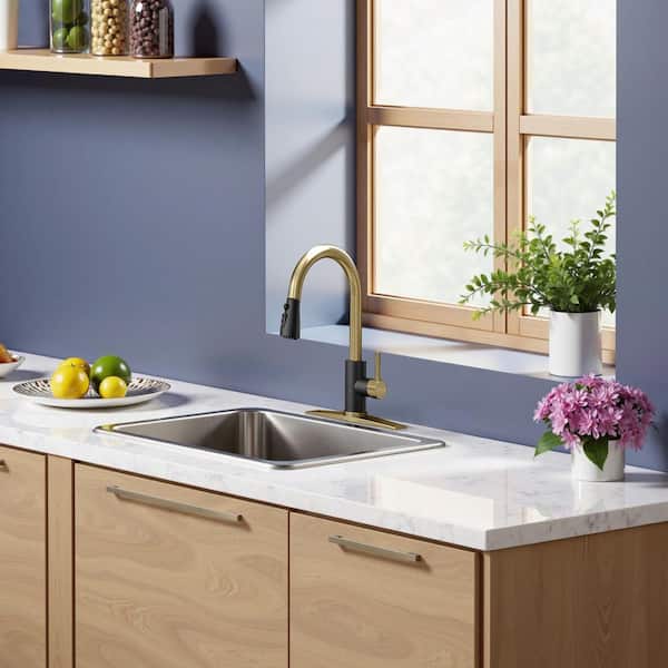Single Handle Pull Down Sprayer Kitchen Faucet with Deck Plate in Black Gold