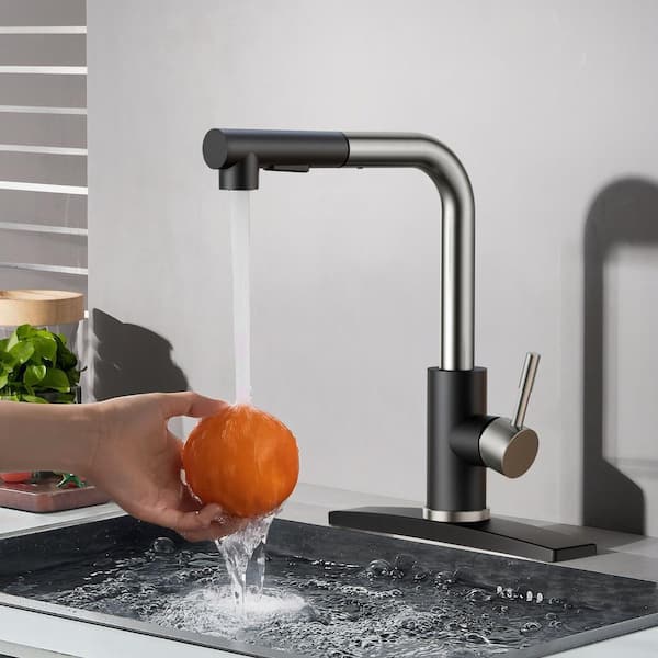 Single Handle Pull Down Sprayer Kitchen Faucet with Deckplate Pull Out Spray Wand in Black Brushed Nickel