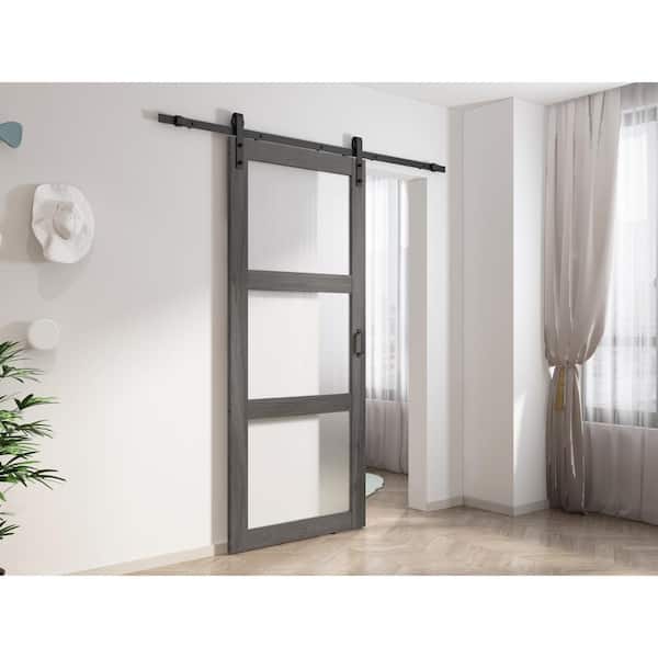36 in. x 84 in. 3 Vision Frosted Glass Dark Gray Solid Core MDF Sliding Barn Door with Hardware Kit