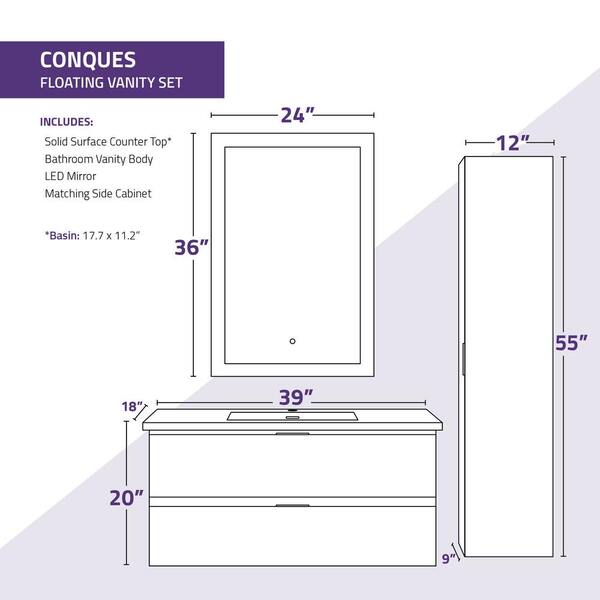 • Includes vanity, top, sink, side cabinet, LED mirror, hardware