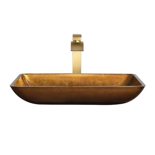 Handmade Countertop Gold Glass Rectangular Bathroom Vessel Sink with Faucet and Pop-Up Drain