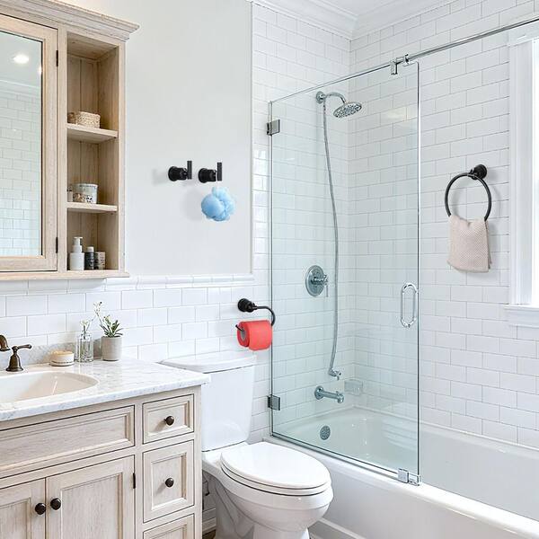 • Toilet paper holder, towel ring and two robe hooks