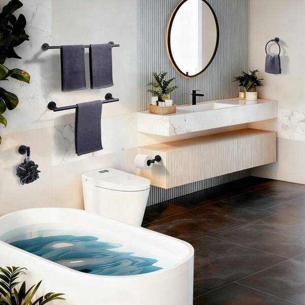 6-Piece Wall Mount Bath Hardware Set with Towel Ring, Toilet Paper Holder, Towel hook and Towel Bar in Matte Black