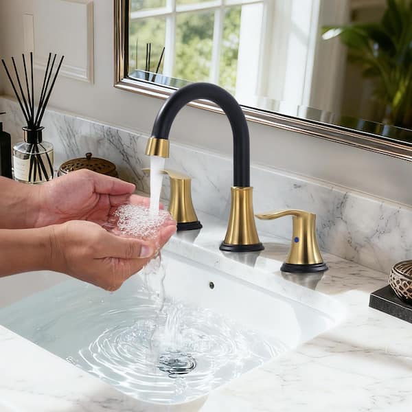 8 in. Widespread Double Handle Bathroom Faucet with Pop-up Drain in Black and Gold