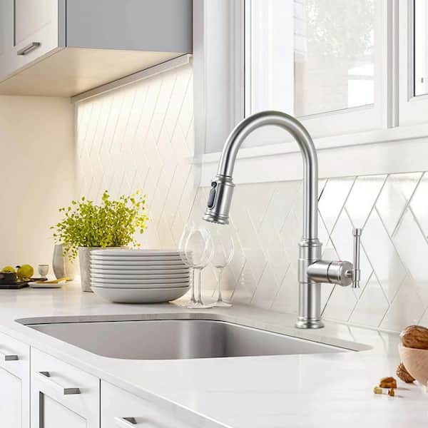 Brushed Nickel Single Handle Pull-Down Sprayer Kitchen Faucet with 3-Mode Sprayer and Deckplate in Stainless Steel
