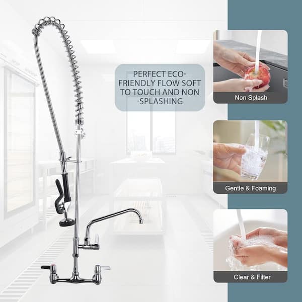 Commercial Triple Handle Wall Mount 43 in. Pull Down Sprayer Kitchen Faucet with Pre-Rinse Sprayer Solid Brass in Chrome