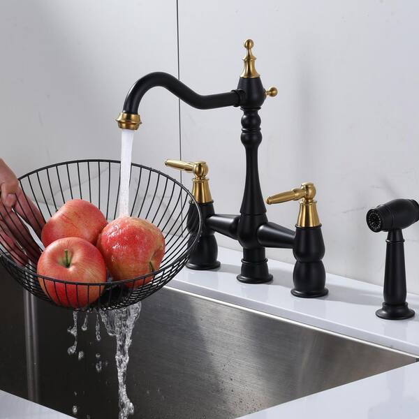 Deck Mounted 4-Hole Double Handle Bridge Kitchen Faucet Solid Brass with Side Sprayer in Black and Gold