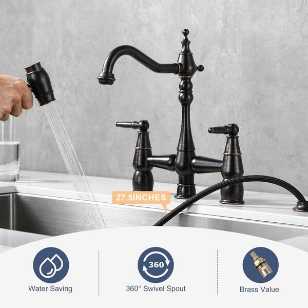 Deck Mounted 4-Hole Double Handle Bridge Kitchen Faucet Solid Brass with Side Sprayer in Oil Rubbed Bronze