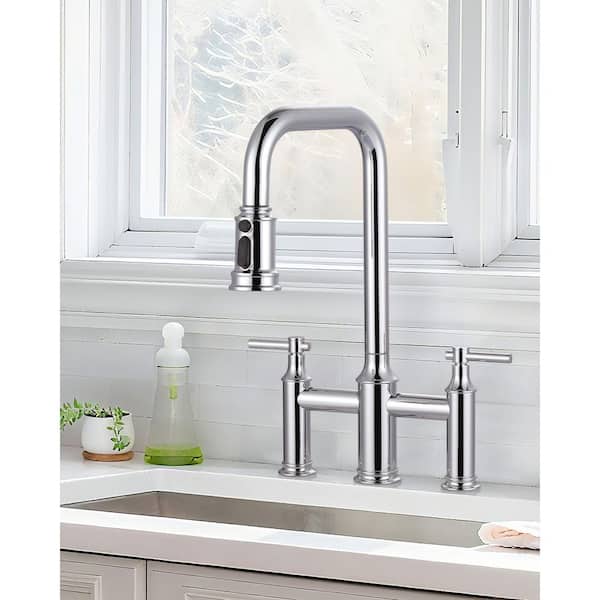 Double Handle Bridge Kitchen Faucet with Pull-Down Spray Head, Deck Mount 3 Holes Kitchen Sink Faucet in Polished Chrome