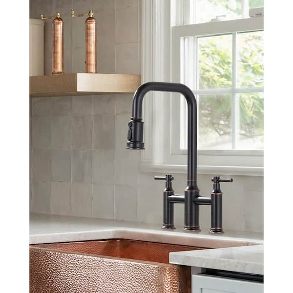 Double Handle Bridge Kitchen Faucet with Pull-Down Spray Head, Deck Mount Kitchen Sink Faucet in Oil Rubbed Bronze