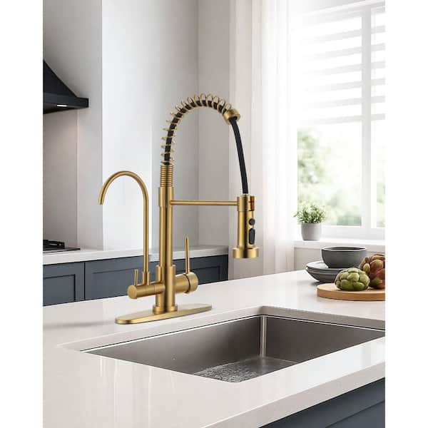 Double Handles Solid Brass Pull Down Sprayer Kitchen Faucet with Drinking Water Filter in Brushed Gold