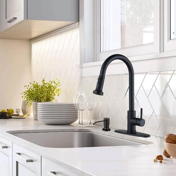 Single Handle Pull-Down Sprayer Kitchen Faucet Set Stainless Steel with Soap Dispenser in Matte Black