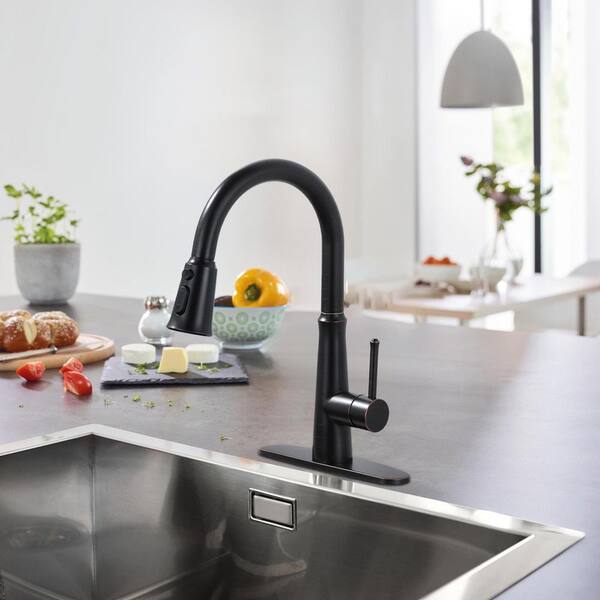Single Handle Pull-Down Sprayer Kitchen Faucet Stainless Steel with Deckplate Included in Oil Rubbed Bronze