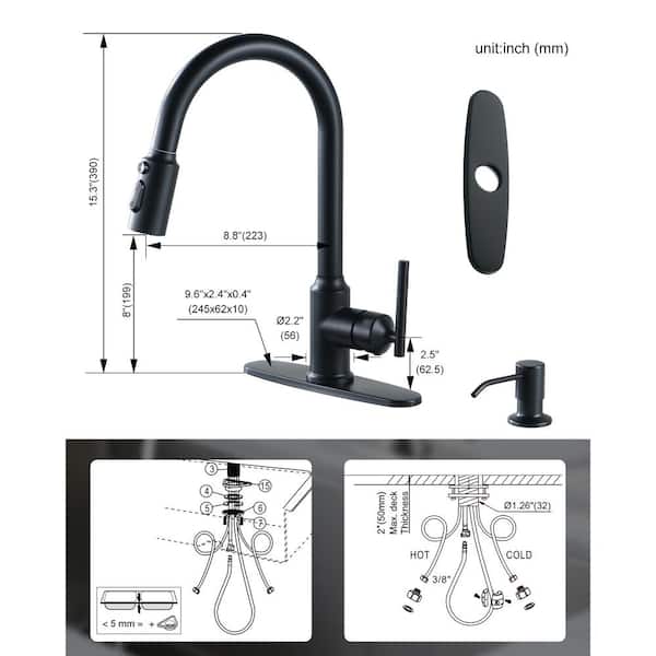 Single Handle Pull Down Sprayer Kitchen Faucet with Soap Dispenser 304 Stainless Steel Sink Faucets in Matte Black