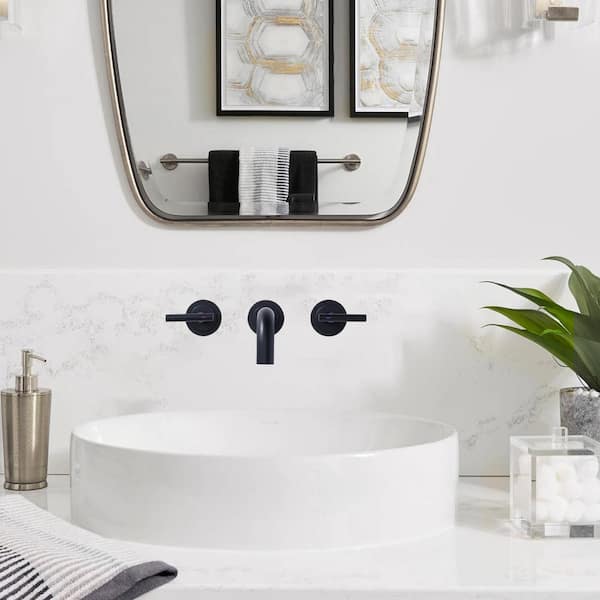 Wall Mount Double Handle Elegant Spout Bathroom Faucet in Solid Brass, Matte Black