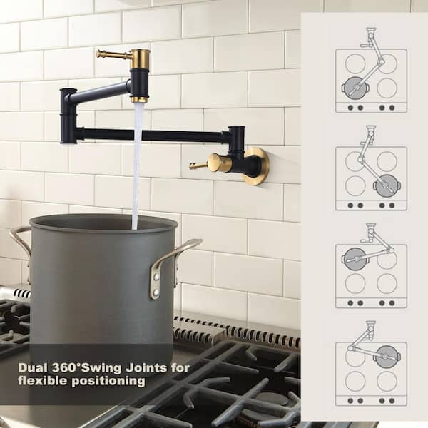 Wall Mounted Folding Pot Filler with Double-Handle Stretchable Kitchen Faucet in Black and Gold