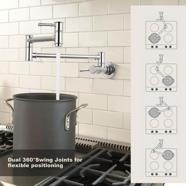 Wall Mounted Folding Pot Filler with Double-Handle Stretchable Kitchen Faucet in Chrome
