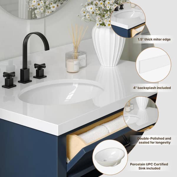 37 in. W x 22 in. D in Pure White Quartz with 1.5 in Thick Milter Edge with White Round Single Sink Vanity Top in White
