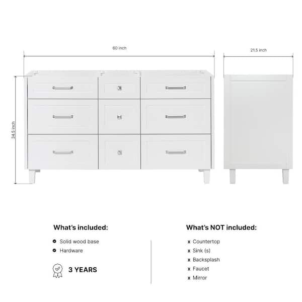 Monroe 60 in. W x 21.5 in. D x 34.5 in. H Bath Vanity Cabinet without Top in White