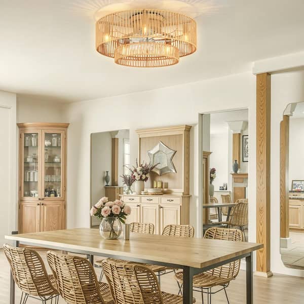 20 in. Indoor Khaki Kraft Paper Rope Cage Ceiling Fan with Lights and Remote Control, Flush Mount Fandalier for Bedroom
