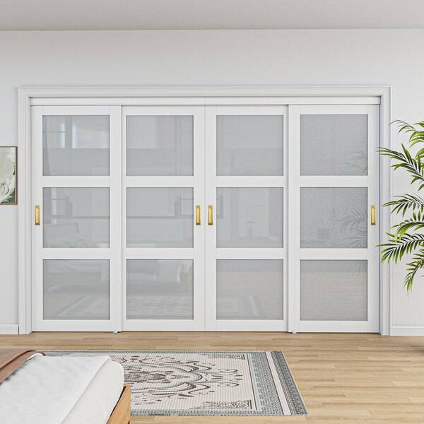 120 in. x 80 in. 3-Lite Frosted Glass White Primed MDF Closet Sliding Door with Hardware and No Grooving Golden Handles