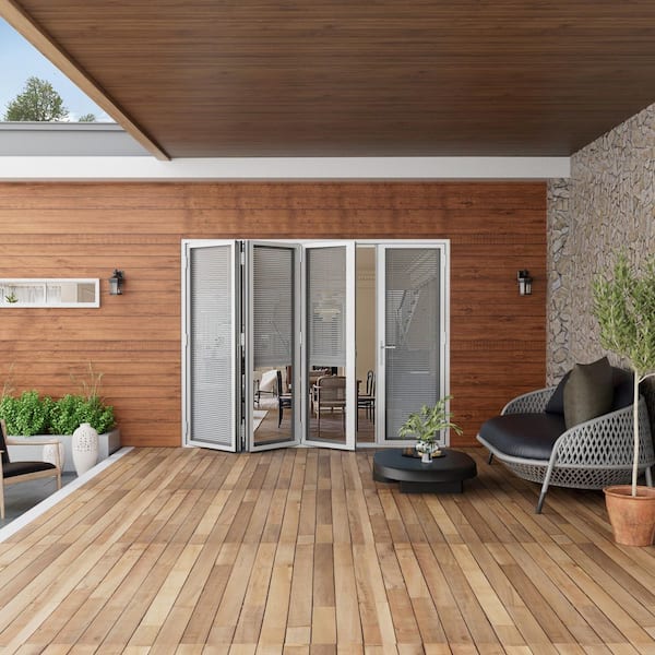 120 in. x 80 in. Right Swing/Outswing Double Tempered Glass White Louver Aluminum Folding Patio Door