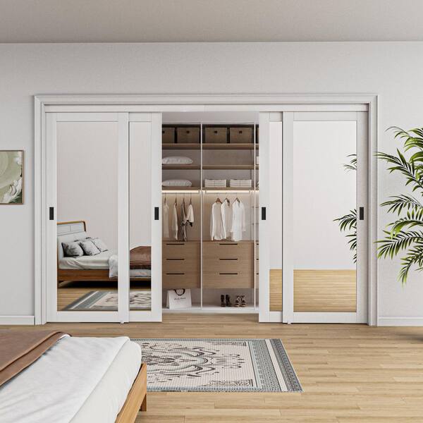 120 in. x 80 in. Solid Core 1-Lite Mirror White Primed MDF Interior Closet Sliding Door with Hardware and Black Handle