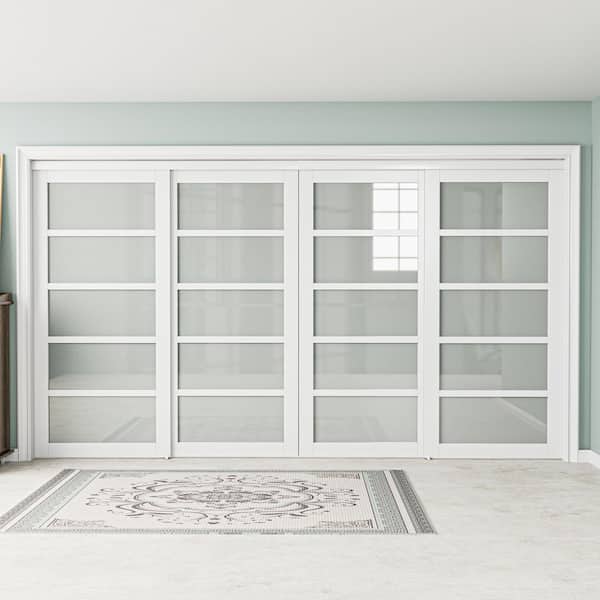 144 in. x 80 in. 5-Lite Tempered Frosted Glass and White MDF Interior Closet Sliding Door with Hardware Kit