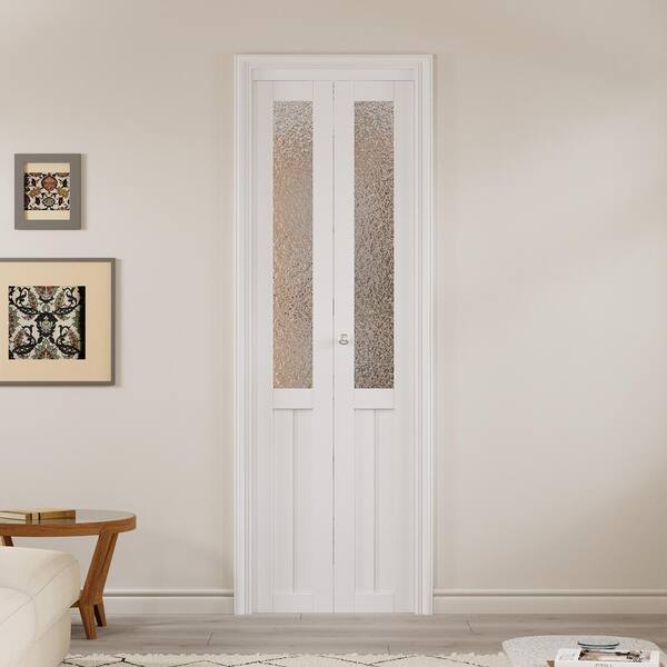 24 in. x 80 in. 1/2 Lite Tempered Kasumi Ripple Glass Solid Core White Finished Glass Closet Bifold Door with Hardware