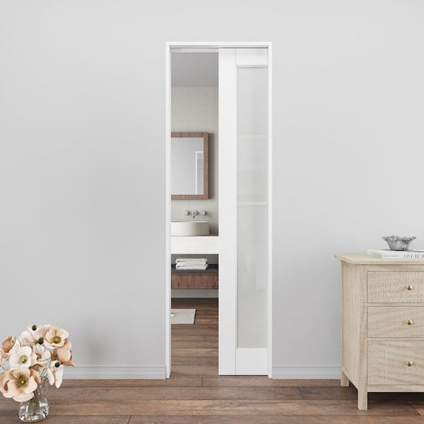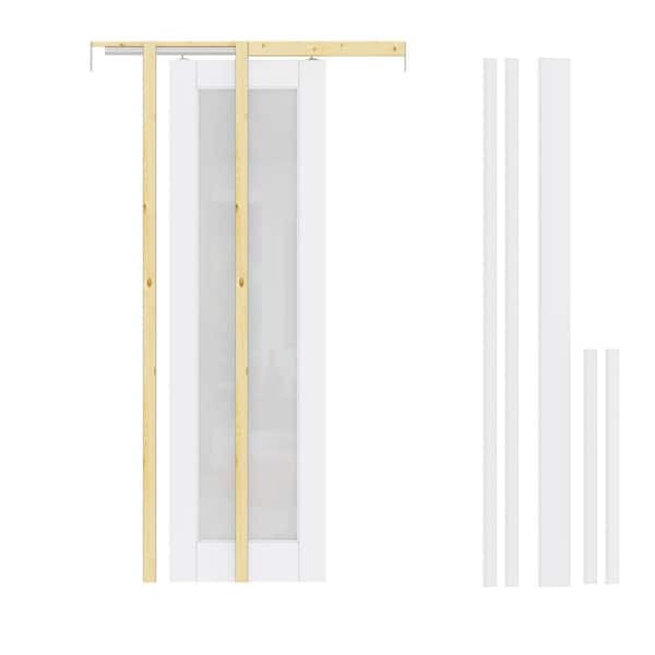 24 in. x 80 in. 1-Lite Frosted Glass Primed White Pocket Sliding Door with Pocket Door Frame, Jamb and Hardware Kit