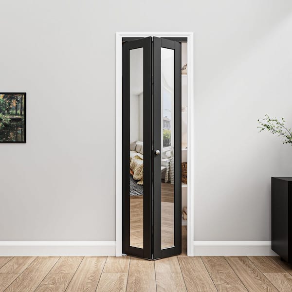 24 in. x 80 in. 1-Lite Mirror Glass and Solid Core Black Finished MDF Interior Closet Bi-Fold Door with Hardware
