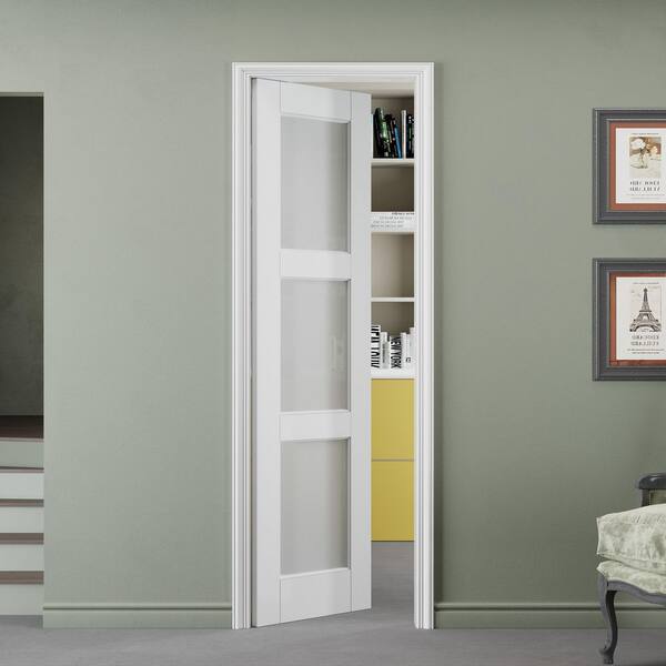 24 in. x 80 in. 3-Lite Frosted Glass Left Handed White Solid Core MDF Door with Quick Assemble Jamb Kit