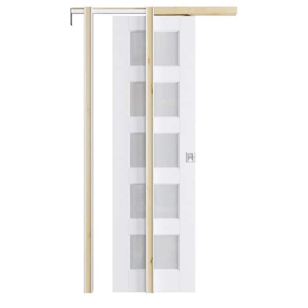 24 in. x 80 in. 5-Lite Frosted Glass Primed Door White Pocket Door Frame and Hardware (Soft Close and Silver Lock Incl)