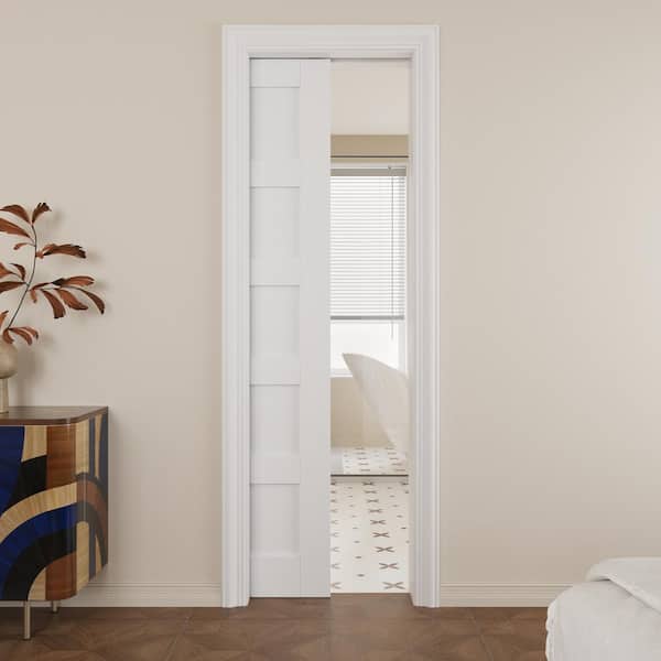 24 in. x 80 in. 5-Lite White Primed Solid Core Door Slab with Wood Pocket Door Frame and Hardware (Soft Close Included)