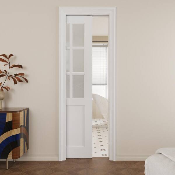 24 in. x 80 in. 6-Lite Frosted Glass White Primed MDF Pocket Sliding Door with Pocket Door Hardware Set and Soft Close