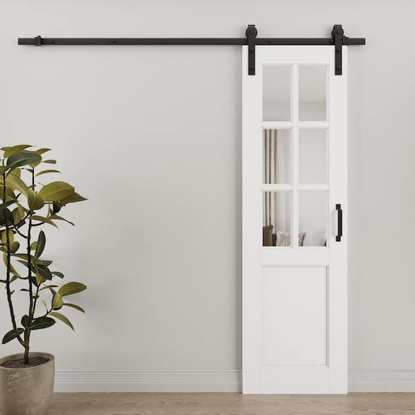 24 in. x 80 in. 6 Lite Tempered Clear Glass White Primed MDF Sliding Barn Door with Hardware Kit