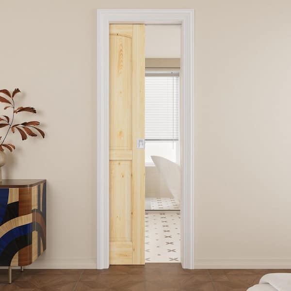 24 in. x 80 in. Arch 2-Panel Unfinished Pine Wood Sliding Pocket Door with Hardware (Soft Close and Silver Lock Incl)