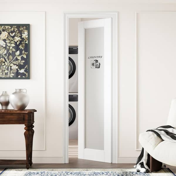 26 in. x 80 in. 1-Lite Tempered Frosted Glass White Primed Solid MDF Interior Door Slab with Peel Sticker (Laundry)
