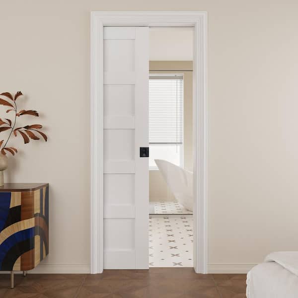 28 in. x 80" Paneled 5-Lite White Primed MDF Pocket Sliding Door with Hardware Kit (Soft Close and Black Lock Included)