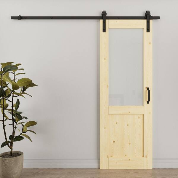 28 in. x 80 in. 1/2-Lite Frosted Glass Solid Core Unfinished Pine Wood Sliding Barn Door with Hardware Kit