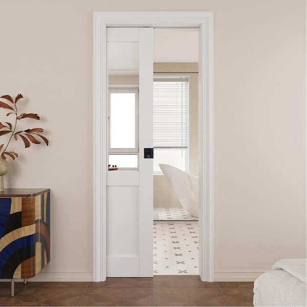 28 in. x 80 in. 1/2-Lite Mirrored Glass White Primed Pocket Door Frame with Hardware Kit (Soft Close Black Lock Incl)