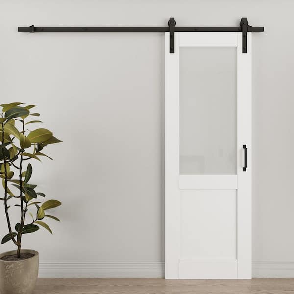 28 in. x 80 in. 1/2 Lite Tempered Frosted Glass White Primed MDF Composite Sliding Barn Door with Hardware Kit