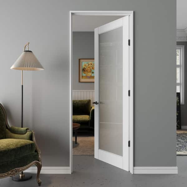 28 in. x 80 in. 1-Lite Frosted Glass Right White Solid Core Wood Single Prehung Interior Door with Quick Assemble Jamb