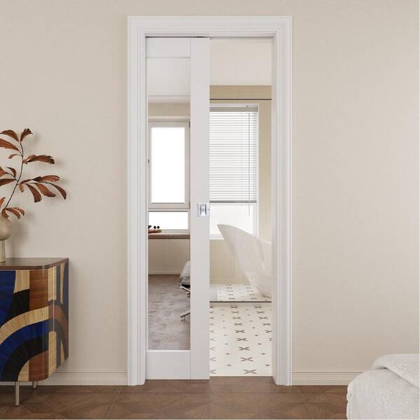 28 in. x 80 in. 1-Lite Mirrored Glass White Door with Pocket Door Frame and Hardware (Soft Close and Silver Lock Incl)
