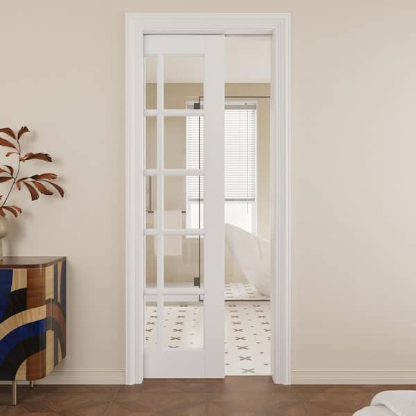 28 in. x 80 in. 10-Lite Solid Core Primed White Clear Glass Pocket Sliding Door with Pocket Door Hardware and Soft Close