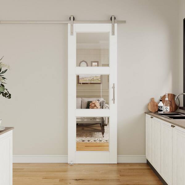 28 in. x 80 in. 3-Lite Tempered Clear Glass White Primed Solid Core MDF Sliding Barn Door with Hardware Kit Nickel