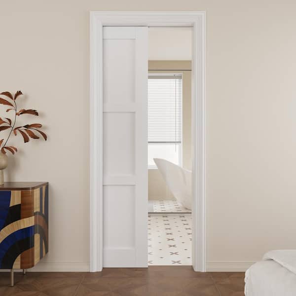 28 in. x 80 in. 3-Lite White Primed Solid Core Door Slab with Wood Pocket Door Frame and Hardware (Soft Close Included)