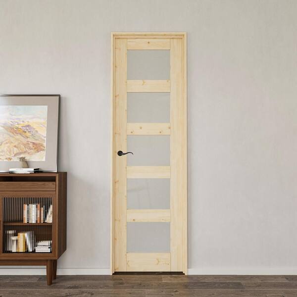 28 in. x 80 in. 5-Lite Frosted Glass Left Unfinished Pine Wood Single Interior Door with Quick Assemble Jamb